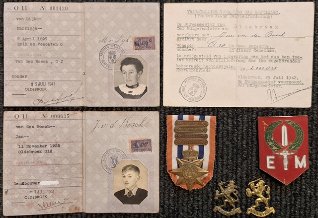 We kregen twee persoonsbewijzen, een bewijs van vrijstelling inleveren fiets. Ereteken voor Orde en Vrede.